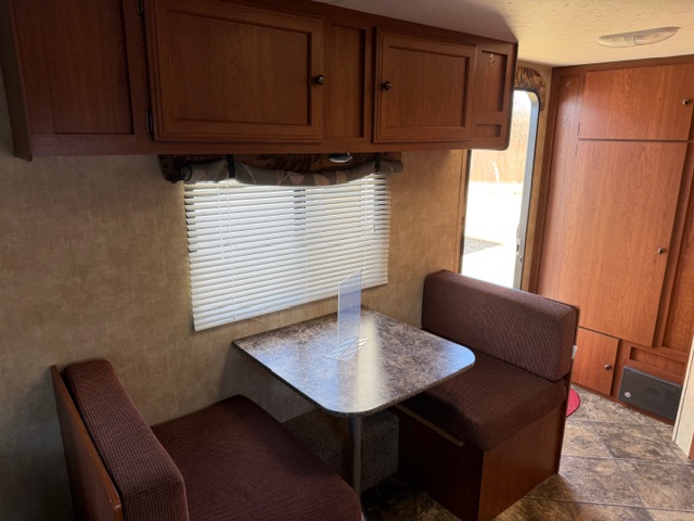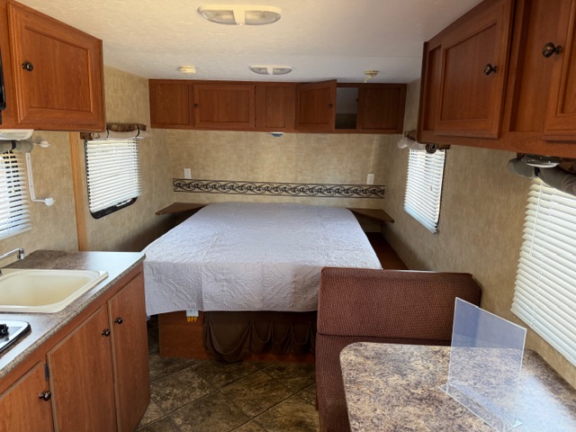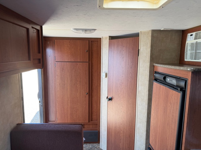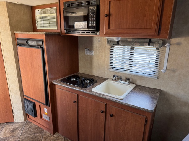 Small Single Axle Travel Trailer with everything anyone could want. A/C is a wall mounted unit. Queen bed in the front with plenty of storage throughout.